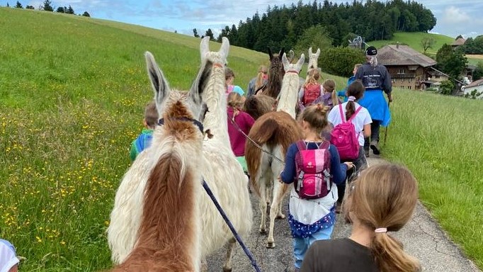 Du begibst dich mit diesen lustigen wunderbaren Tieren auf ein Trekking. Ein bisschen fit sein solltest du schon, die reine Marschzeit beträgt etwa 1 bis 1,5 Stunden. Um die Verpflegung musst du dich nicht kümmern: die Tiere tragen zu Trinken für unterwegs mit und nach der Rückkehr zum Hof gibt es Zvieri. - CM